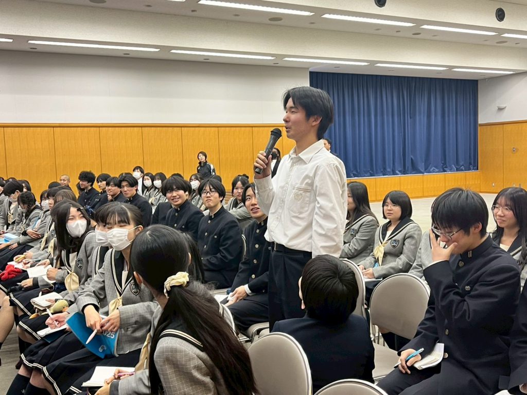 その後の質問タイムでは、多くの生徒が積極的に手を挙げ、日頃疑問に思っていることを率直に質問しました。齋藤選手は一つ一つ丁寧に答えてくださいました。