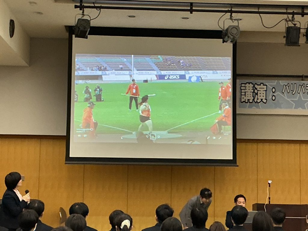 事前学習では、オリンピックとパラリンピックの違いや障がい者スポーツについて学ぶとともに、実際に砲丸投げも体験しました。競技への理解を深めたうえで講演に臨むことができました。