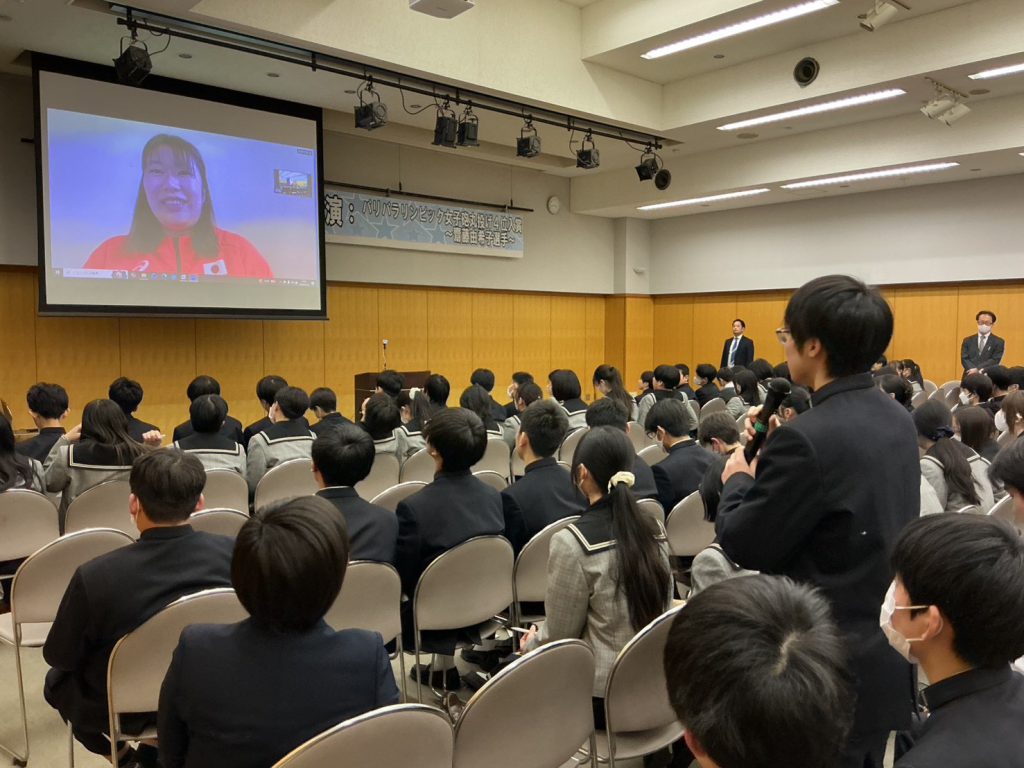 講演では、ご自身のこれまでの歩みや競技への思いをお話しくださいました。人の目が気になった経験もあったそうですが、前向きな考え方で困難を乗り越えてきたことを語られました。中でも「自分の魅力を武器に」という言葉が、生徒たちの心に強く残りました。