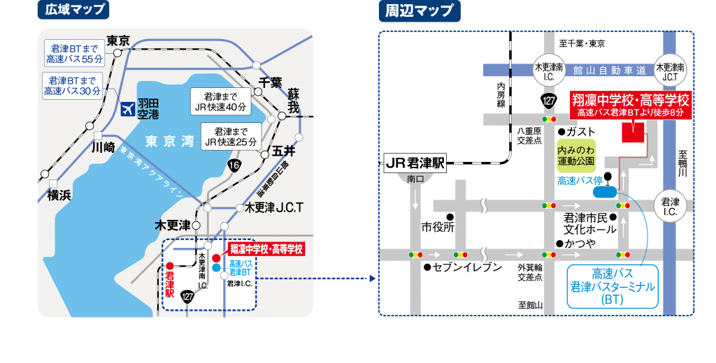 ●君津線/JR君津駅~学校(約15分)●光風台線/光風台・上総牛久駅・馬来田・久留里・小糸~学校